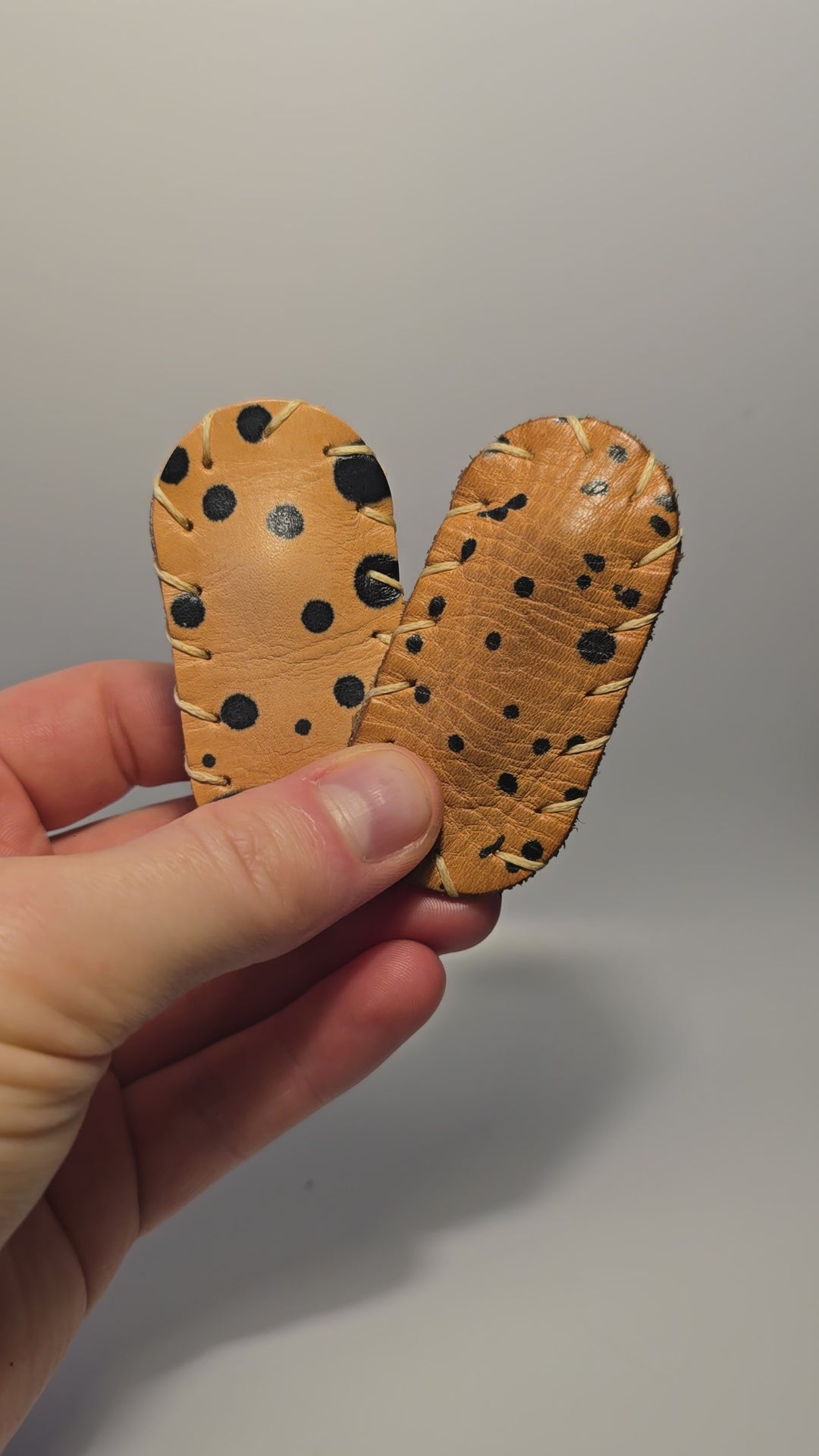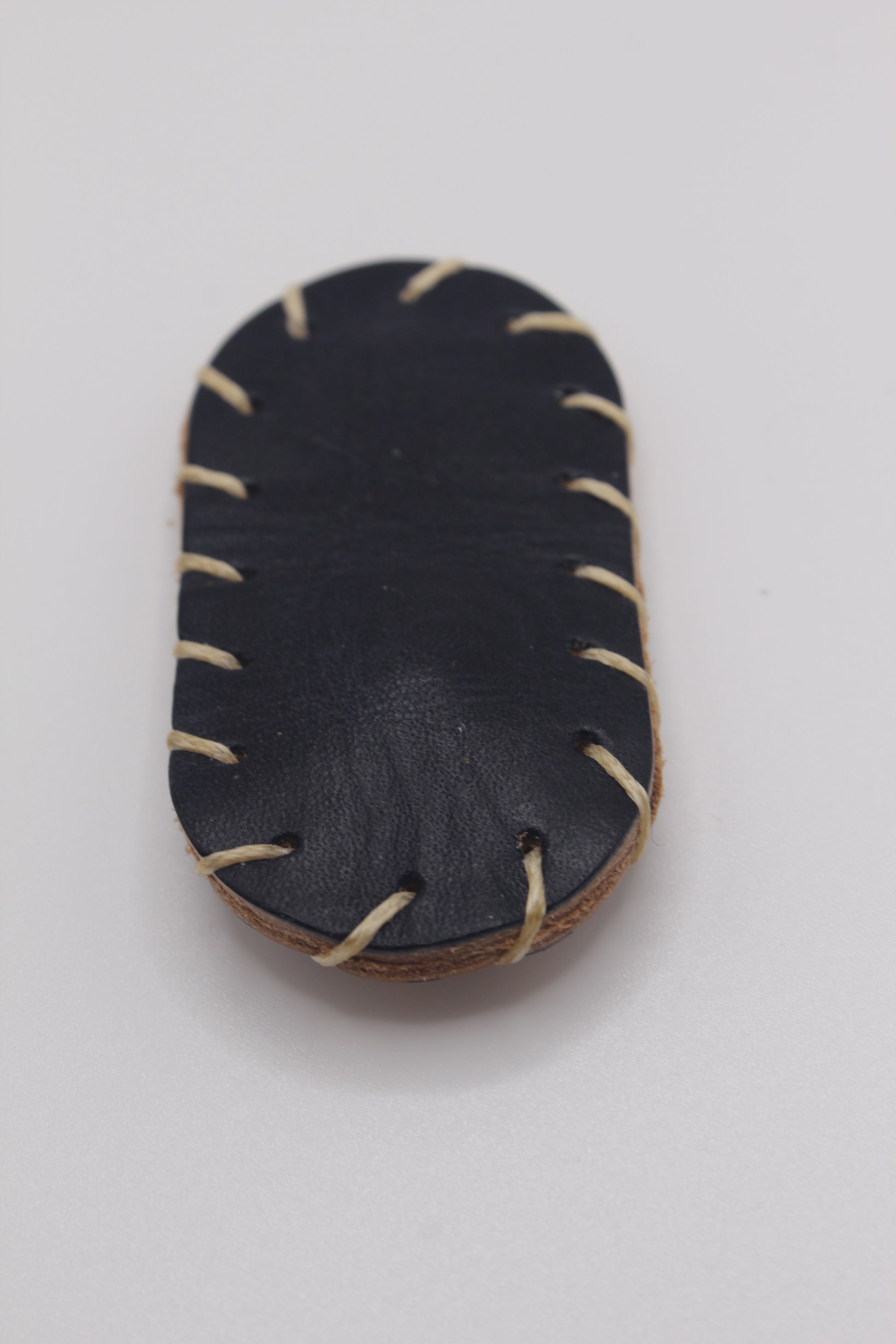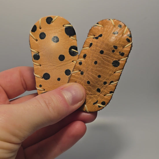 This Cherry SLIDE is made of 5 oz vegetable-tanned leather, brown and black water-based dye, and white waxed cotton thread, sewn in a whip stitch for maximum longevity. Each toy is individually finished by hand, making every piece slightly unique.